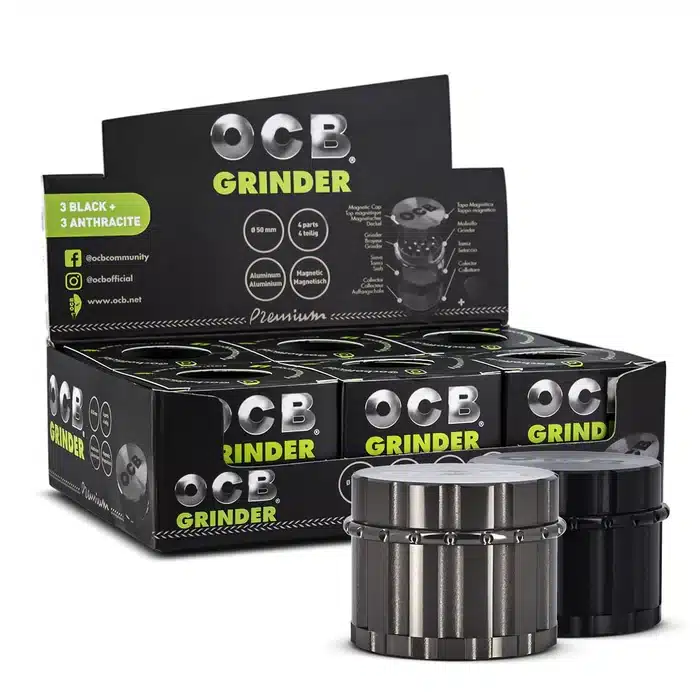 Moledor OCB: Robusto moledor de 4 piezas, fabricado 100% con aluminio. El display contiene 6 moledores.
