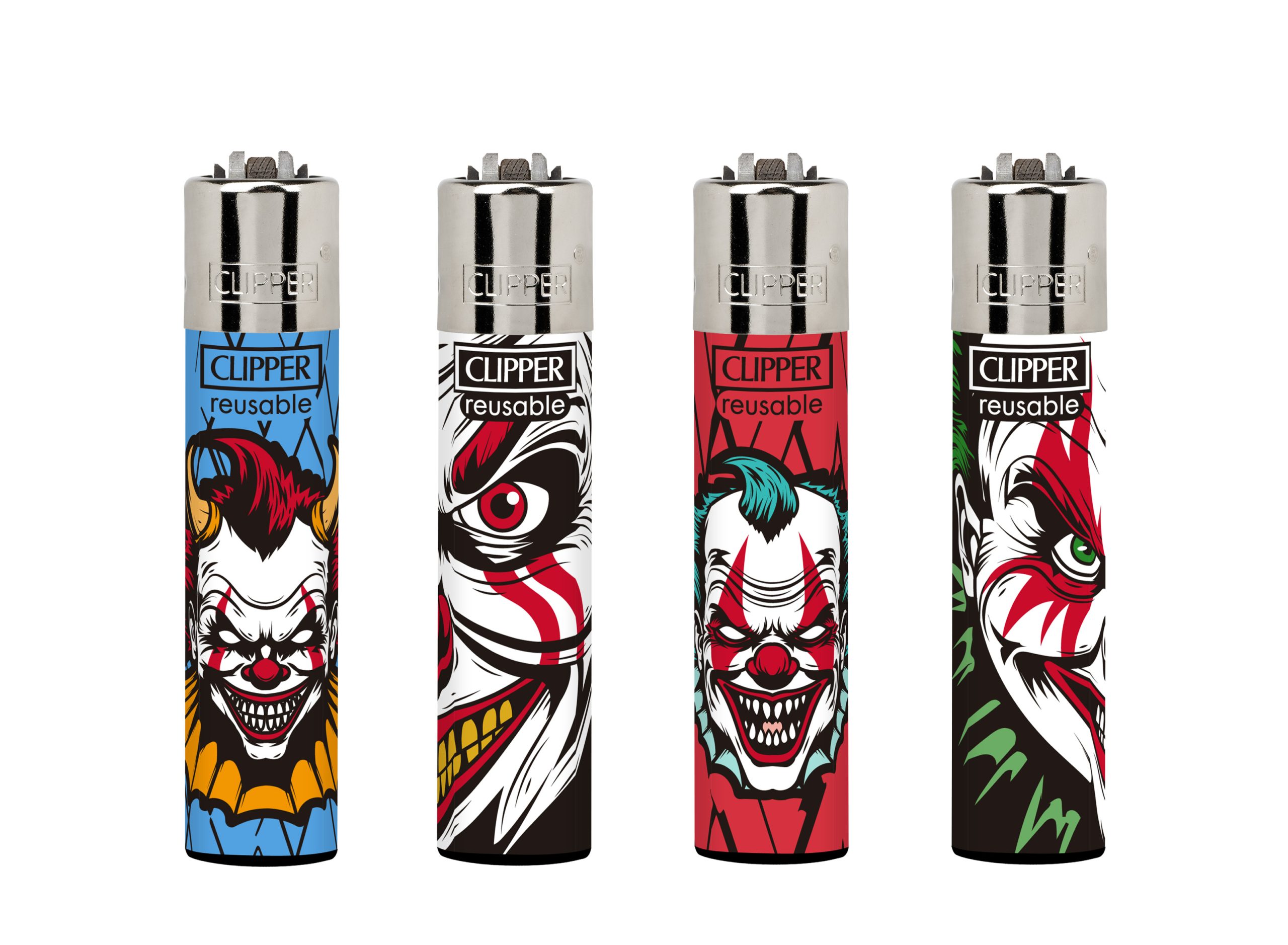 Entre lo tierno y lo inquietante, llegan los LOVELY CLOWNS. 4 diseños de payasos con mucho color y un toque coleccionista, en un display de 24 encendedores Clipper que le dan alegría (y misterio) a tu tienda.