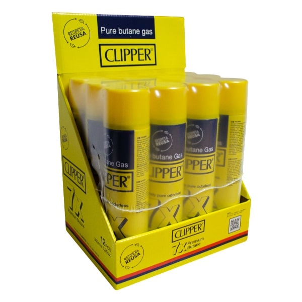 Display con 12 tanques de gas isobutano de 300 ml. Producto oficial de Clipper para recarga de sus encendedores.